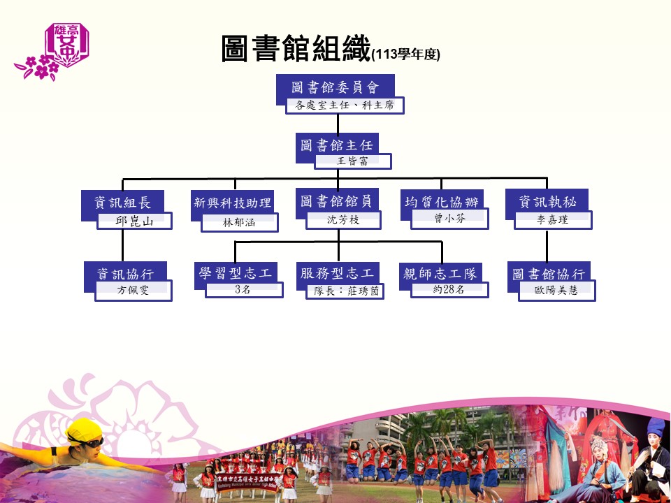 高雄女中圖書館編制主任1名,管理員(幹事)1名。因應業務分工,下設資訊組1名(協行1名)、資訊執秘1名(協行1名)。配合計畫執行增設均質化協辦1名、聘任新興科技助理1名。